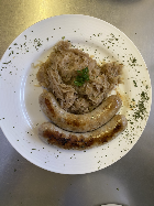 - 1 Liverdumplings, 1 Bratwurst with pickled cabbage and bread