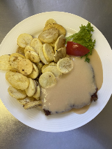 - Creamschnitzel breaded with fries and salad